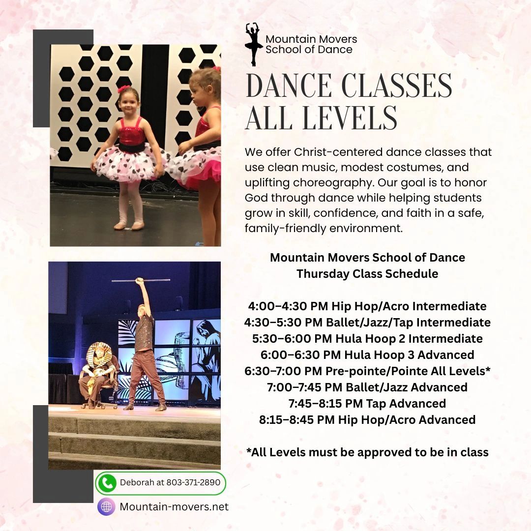 Our Christian Recreational Dance Classes offer a joyful and encouraging environment where students can explore dance through a Christ-centered lens. These classes focus on building strong technique in styles like ballet, jazz, tap, acro, and worship dance while promoting modesty, integrity, and creativity. With uplifting music, age-appropriate choreography, and a nurturing atmosphere, students grow not only as dancers but also in character and faith.